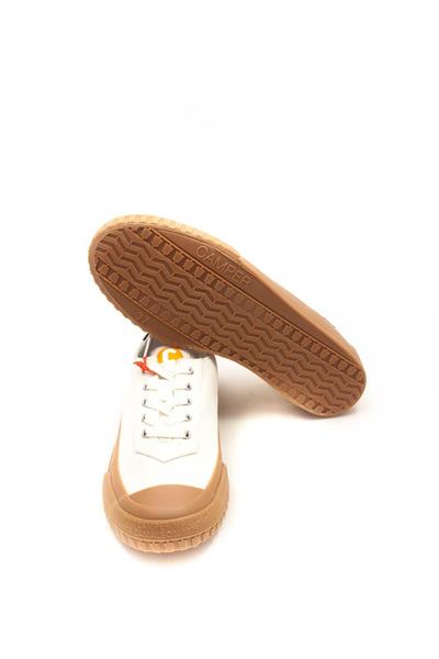 Sneaker de tejido natural 90% de algodón en color blanco para mujer. Suela marrón de caucho 23% reciclado. La línea inspirada en el primer zapato Camper es ya un icono del calzado informal. Símbolo de resistencia, simplicidad y esencia mediterránea, Camaleón 1975 rememora el calzado rústico usado en Mallorca hace más de un siglo y lo salpica de elementos nuevos, contemporáneos y sostenibles, como la suela de caucho reciclado y el algodón natural.