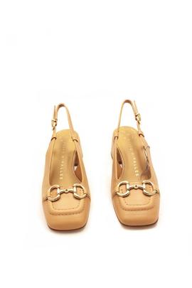 Zapato tacon de 4cm talon destalonado con punta cerrada y adorno delantero en dorado.