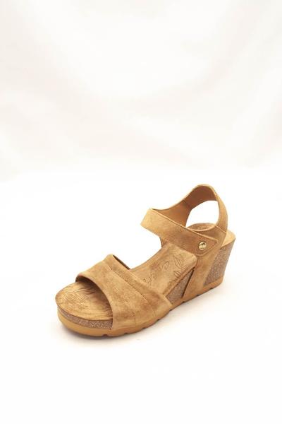 Sandalia de mujer con cuña. Cierre de velcro. Piel Velour Cuero. Forro interior de Piel. Plantilla anatómica.Suela de eva, ligero, flexible, resistente y adherente. Altura tacón: 6.5 cm. Hecho en España.
