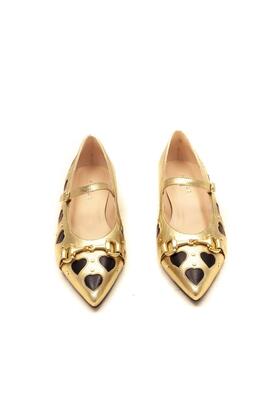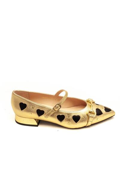 Manoletina en piel dorada con corazones en piel negra,con trabilla en el empeine para su sujeccion, y una hebiila de adorno en la punta del zapato que le da un toque diferente, forro y plantilla de piel, tapa tacon de 2cm.