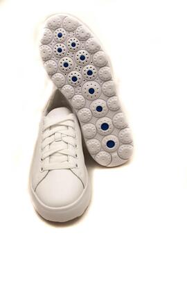 Deportiva Spherica en color blanco con el refuerzo del talon en dorado, piso de 2cm de alto, cierre con cordones, no pesa nada es super ligero.